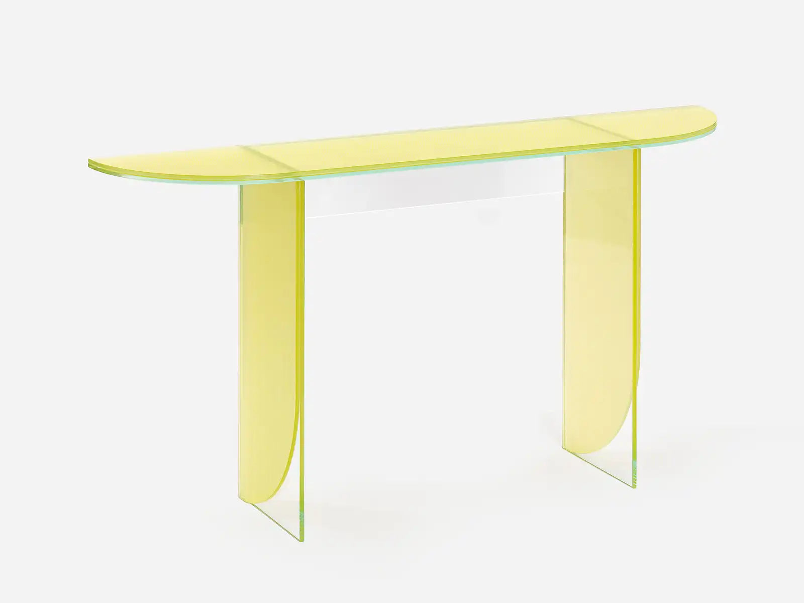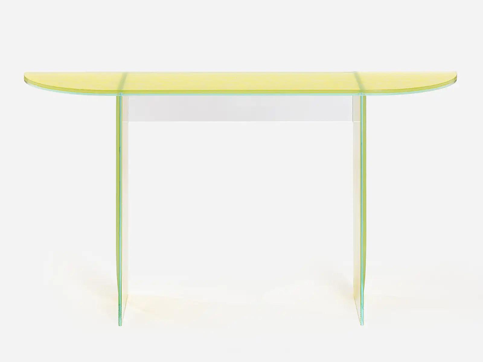 Comme sa grande sœur, la petite console de la collection ILLUSION est une parfaite combinaison de rectangles et d'arrondis 100% en verre, made in France. Cette pièce d'exception est le résultat d'un savoir-faire unique de nos miroiteries et de l'ingéniosité d'Alain Gilles.