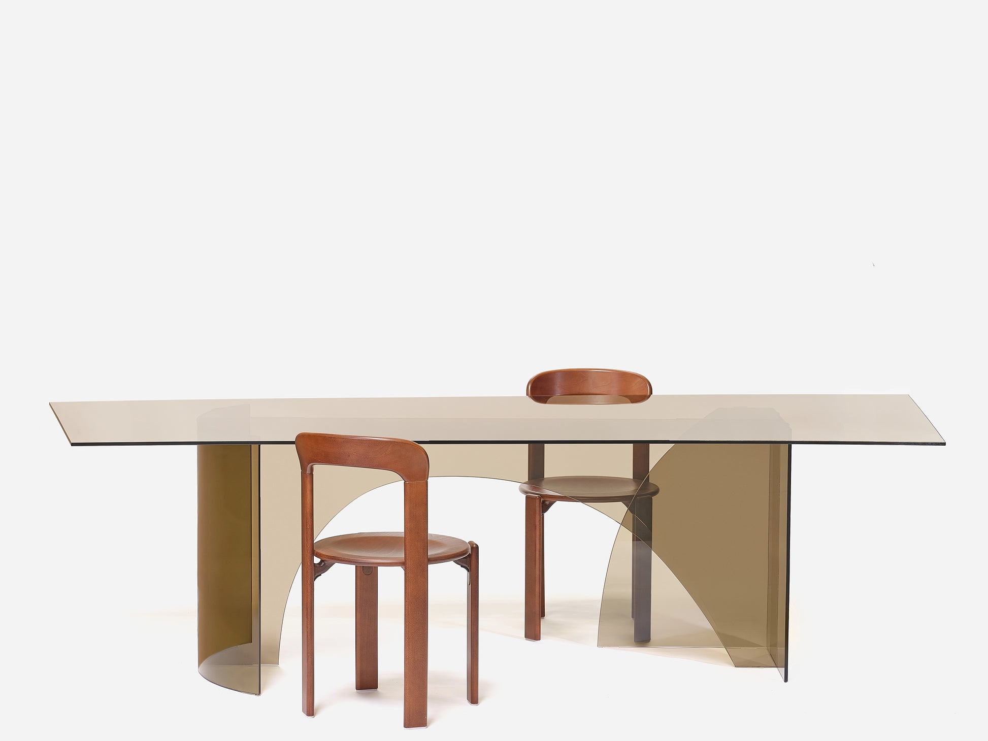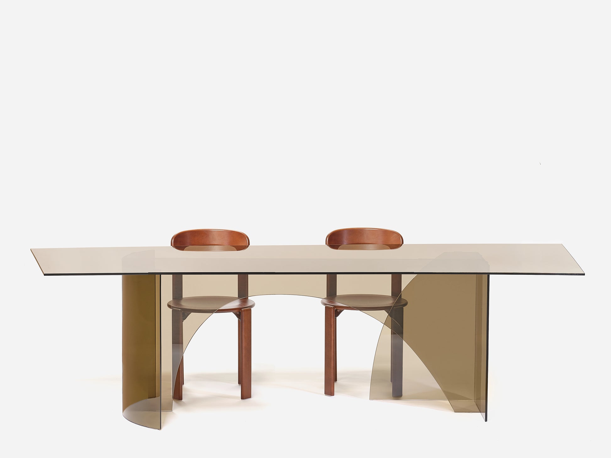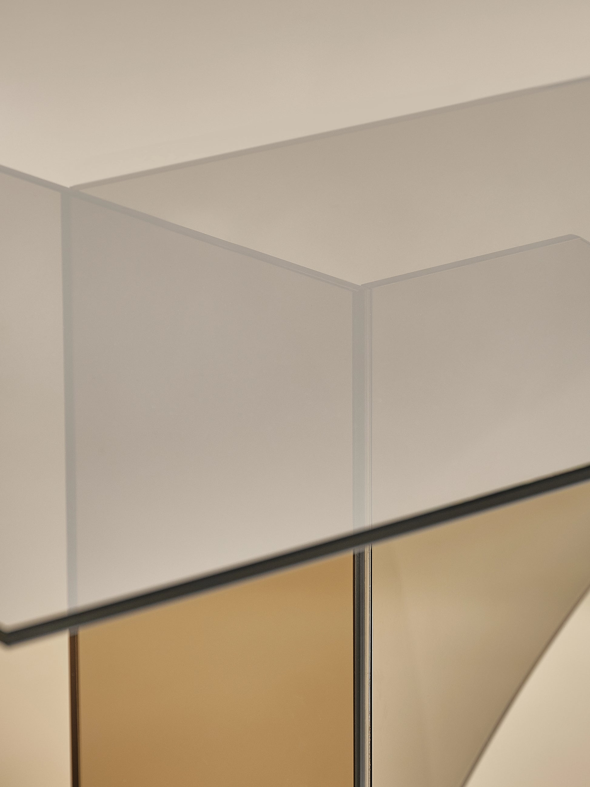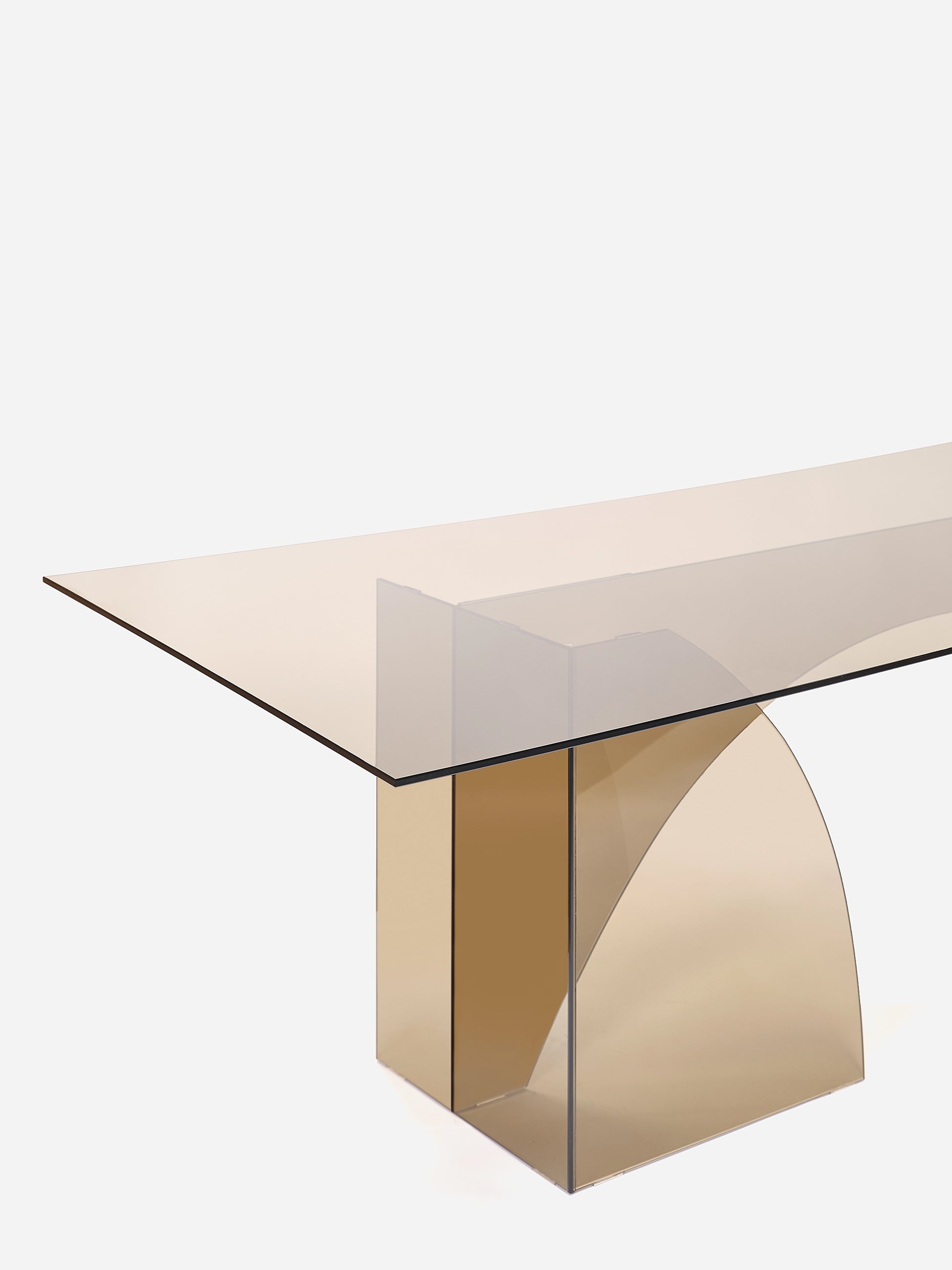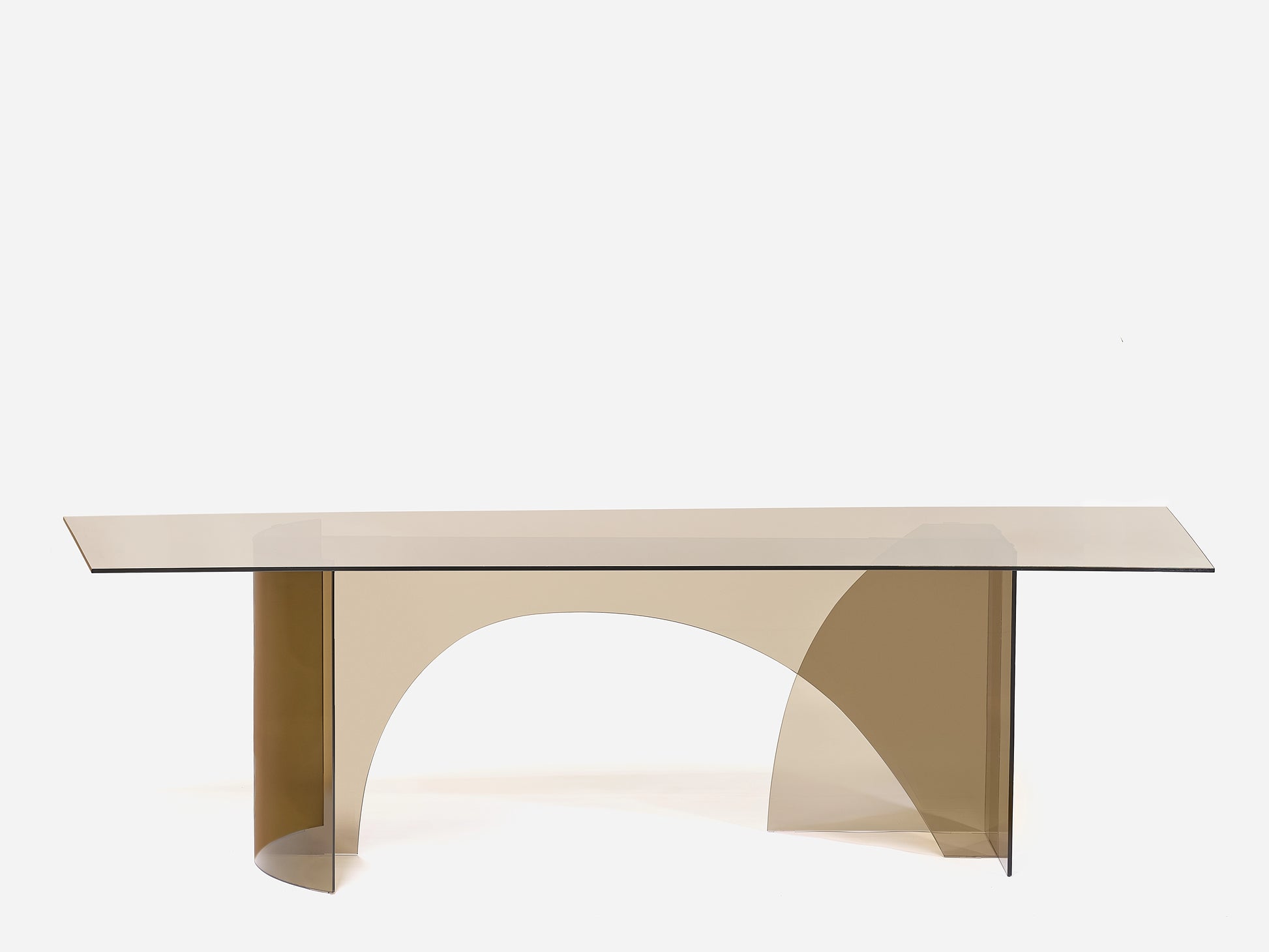 Verre teinté bronze 10mm d'épaisseur, sauf pour les pieds en verre bombé. Assemblée de manière invisible par collage UV, réalisé à la main dans nos ateliers par nos maîtres verriers. Variations : teinté bronze, teinté gris, extra-clair, azzurra Fabrication française à la demande. Délai de fabrication : 12 semaines -